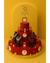 Торт круглой формы в 4 яруса, покрытый белым шоколадным велюром. Торт украшает оригинальный декор, который представляет собой волнистые полосочки из белой вафельной бумаги с золотыми точками по центру, которые придают геометрию дизайну. Дополняют композицию Топпер Инициалы золотого цвета и объемные лилии, выполненные из белой вафельной бумаги в общей стилистике торта.