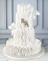 Торт круглой формы, в 4 яруса покрытый шоколадным велюром белого цвета. Нижние ярусы торта украшены воздушным декором из белой вафельной бумаги в разной стилистике. Нижний ярус выполнен в виде нежной объемной композиции, которая гармонично сочетается с декором второго яруса, выполненным тонкими полосками вафельной бумаги. Дополнительно два нижних яруса украшены воздушными пёрышками из вафельной бумаги. Третий ярус покрыт белым шоколадным велюром и дополнительно украшен сахарными жемчужинками разных размеров. Верхний ярус так же покрыт шоколадным бархатным велюром белого цвета и дополнен топпером с Инициалами золотого цвета.