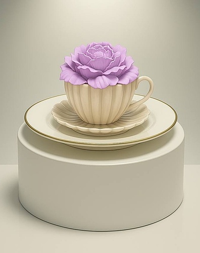 Десерт, который разработан специально для Вас и будет выполнятся впервые. Десерт в изысканной кремово-белой шоколадной чашечке с шоколадным блюдцем с рельефными узорами. Верхняя часть десерта будет украшена объемным цветком, выполненном из шоколадной пасты в нежно-сиреневом оттенке.