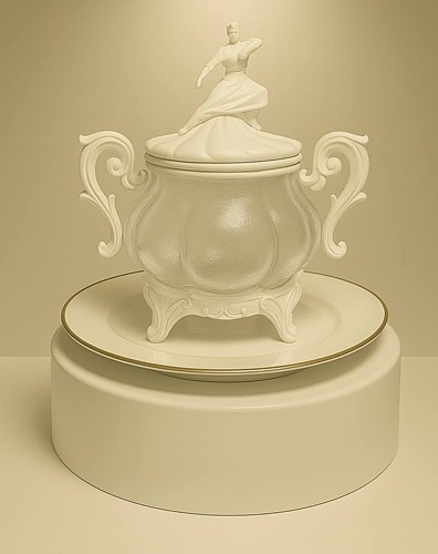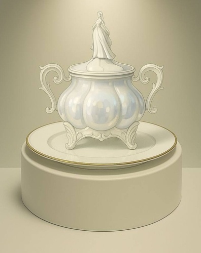 Эксклюзивный десерт в полностью съедобной шоколадно-карамельной посуде. Чаша будет выполнена из прозрачной карамели, а остальные шоколадные части будут выполнены из шоколада в белом цвете с перламутром. Крышку десерта будут украшать шоколадные фигурки Джигита и Горянки в белом цвете с перламутром (лица будут абстрактные, размер фигурок по высоте около 7-8 см) – часть десертов будут с фигуркой девушки, часть с фигуркой мужчины, как на эскизе.
