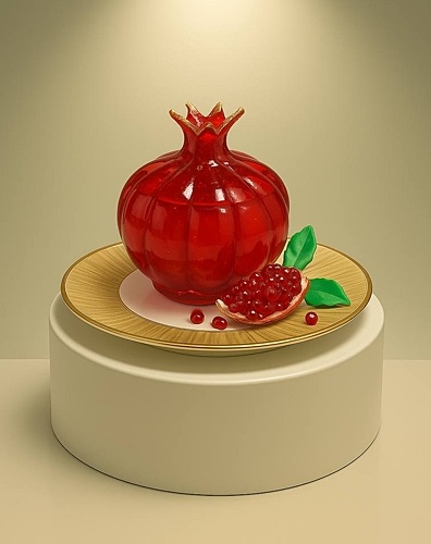 Десерт в виде граната из карамели, который внутри наполнен нежнейшей начинкой, а поверхность рядом с десертом украшают дольки граната из карамели и шоколада. Дополняют десерт красивые зеленые листочки и сусальное золото, точечно.