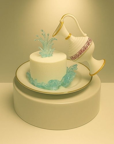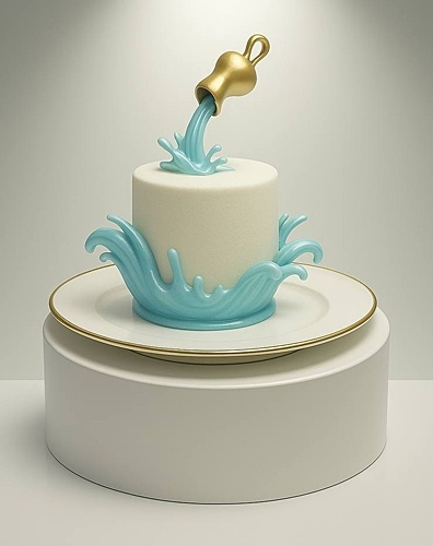 Порционный десерт в виде мини торта, покрытый белым бархатным велюром. Десерт, по кругу, будет обрамлять волна из карамели, выполненная в голубом цвете. Сверху или сбоку на десерт будет облокачиваться небольшой кувшин, выполненный из белого шоколада, из которого будет струиться карамельная вода. Все декорации абсолютно съедобные.