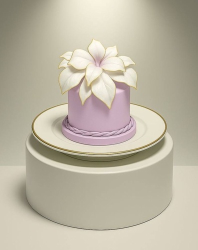 Порционный десерт в виде мини тортика, покрытый сиреневым бархатным велюром. Десерт украсит цветок, выполненный из шоколада белого цвета с сиреневой тонировкой по центру цветка. Контур лепестков оттонирован золотом.
