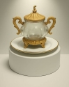 Десерт по фото – карамельная чаша красного цвета, на прозрачном подиуме с подсветкой, сверху десерт накрывается карамельным куполом.