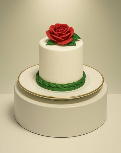 Порционный десерт в виде мини тортика, покрытый белым бархатным велюром. Десерт будет располагаться на шоколадном постаменте белого цвета, который сверху будет украшен канатиком зеленого цвета. Верхнюю часть десерта украсит красная шоколадная роза и зелеными листиками.