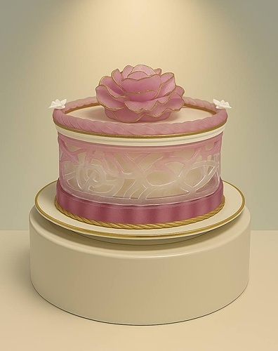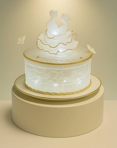 Десерт в виде роскошной шкатулки, выполненный из шоколада и карамели с использованием подсветки. Нижняя часть десерта, донышко, будет выполнено из карамели, внутри которого будут интегрированы диоды. Боковая стенка, основа будут выполнены из шоколада. Верхняя композиция, на крышке десерта, будет в виде красивого карамельного цветка с подцветкой, внутри которого будет золотой шоколадный силуэт жениха и невесты. Боковые объемные узоры, которые повторяют рельеф из пригласительного, будут выполнены из шоколада и которые мы можем предложить оторвать, на небольшое расстояние от шкатулки, и покрыть золотым цветом – за счет подсветки, которая будет исходить из карамельного основания, узор будет выглядеть еще более объемным и красивым