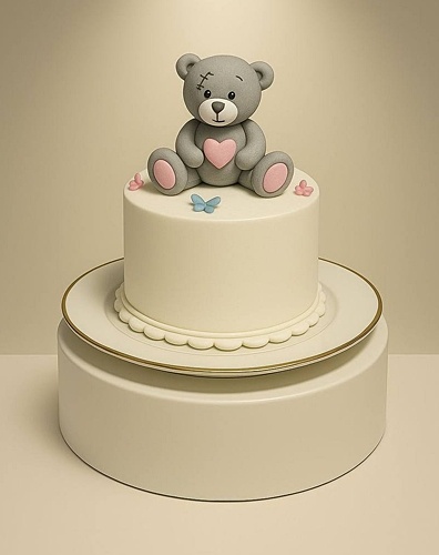 Порционный десерт в виде мини тортика, покрытый нежно-розовым бархатным велюром. Десерт будет располагаться на красивом резном постаменте из шоколада в розовом цвете, а верхнюю часть десерта украсит небольшая фигурка шоколадного серенького Мишки Тедди и небольшое количество сахарных бабочек белого и нежно-розового цвета. Так же такой формат десерта можно сделать в голубой гамме