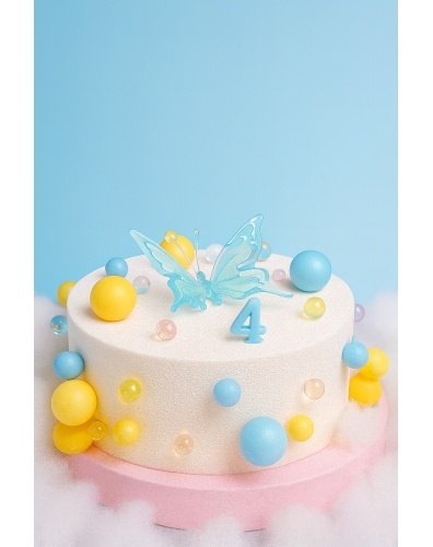 Торт в 1 ярус, покрытый бледно-розовым шоколадным велюром. Торт украшен разноцветными карамельными и шоколадными шариками и карамельной бабочкой голубого цвета.