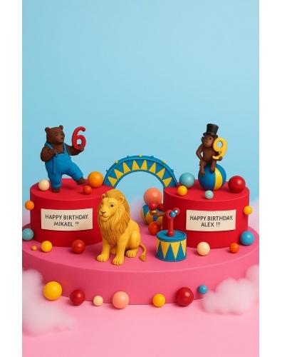 из тортов украшает цирковой мишка на самокате, выполненный из сладкой