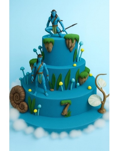 Торт в 3 яруса, круглой формы, покрытый ярко голубым бархатным велюром. Торт украшают декорации, выполненные из сладкой массы на основе какао масла и шоколада в стиле волшебной планеты Пандора — 2 фигурки Аватаров, волшебные цветы, грибы, листья и парящие горы. Дополняют торт небольшое количество шариков из карамели в голубом и желтом цвете с подсветкой. Начинка располагается в нижнем ярусе, по выступающей части. Так же можно рассмотреть начинку в нескольких ярусах.