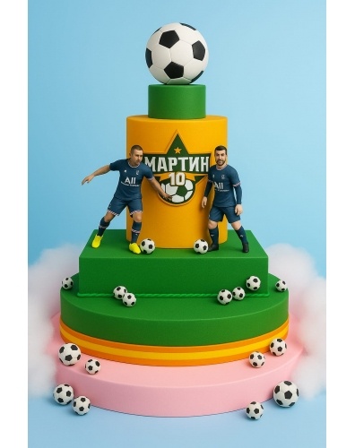 Яркий стильный торт в 4 яруса, покрытый ярко-оранжевым и зелёным бархатным велюром. Верхние 2 яруса имеют круглую форму, нижние 2 яруса — квадратную. На верхнем ярусе располагается большой футбольным мяч из шоколада в оригинальное цветовой гамме. На среднем ярусе располагается сладкий логотип с тематической надписью. На одном из нижних ярусов располагаются 2 фигурки футболистов в интересных живых позах, которые выполняются из сладкой кондитерской массы на основе какао масла. Самый нижний ярус торта обрамляет сладкая лента оранжево-желтого цвета. Дополняют торт хаотично шоколадные футбольные мячики оригинальной расцветки разного размера, которые располагаются небольшими группами и по одному.