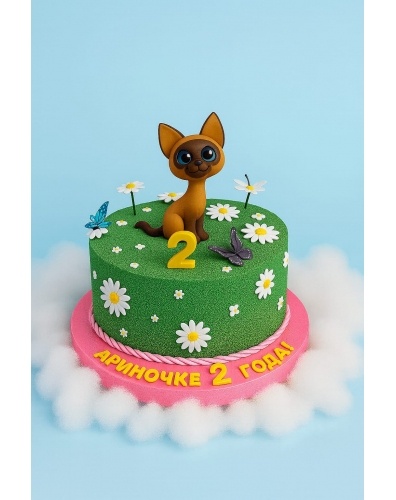 В центре торта располагается объемная фигурка котенка, выполненная из сладкой массы на основе какао масла.
