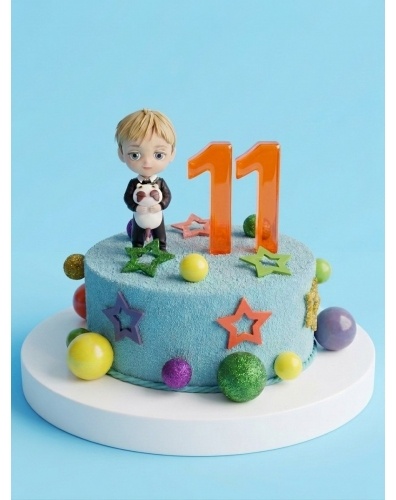 Круглый торт в 1 ярус, покрытый голубым шоколадным велюром. Главным украшением торта выступают фигурка мальчика с котом в стиле аниме, выполненная скульптором из сладкой массы и большая карамельная цифра 11. Дополнительно торт украшен хаотично расположенными шоколадными звездочками и шариками разного размера, фиолетового, ярко-желтого, кораллового цвета с блёстками и без. По низу торт украшен канатиком из сладкой массы и шоколадным логотипом в цвет торта.