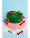 Торт круглой формы, в 2 яруса, покрытый бежевым бархатным велюром. Торт украшают реалистичные животные слон и жираф в интересных живых позах, выполненные из сладкой кондитерской массы на основе какао масла, а так же точечно поверхность ярусов украшена корягами и веточками с листиками и без в стиле «сафари». Дополняют торт участки с травой из шоколада реалистичного зеленого оттенка и в цвете выгоревшей травы.