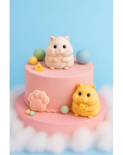 Круглый торт в 1 ярус, покрытый шоколадным бархатным велюром нежно-розового цвета. Главным украшением торта являются разноцветные фигурки сквишей хомячков и лапок, а также кусочки сыра, выполненные из сладкой массы на основе какао-масла. Поверхность торта дополнительно украсят разноцветные шоколадные шарики разного размера с перламутром. Дополнительно можно добавить шоколадную цифру на торт, а так же надпись шоколадными буквами перед тортом.