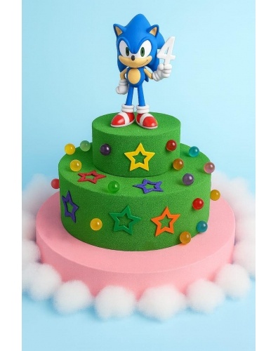 Торт в 2 яруса, круглой формы, покрыт зеленым бархатным велюром. На верхнем ярусе, на шоколадном постаменте в цвет торта, располагается фигурка Соника, выполненная из сладкой кондитерской массы на основе какао масла. Весь торт хаотично украшают маленькие карамельные шарики разных цветов, а также шоколадные контурные звездочки в разноцветном исполнении с блестками и без.