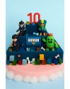 Торт украшают объемные фигурки героев животных, выполненные из сладкой массы на основе какао масла — 2 героя располагаются на верхнем ярусе и обнимают большую карамельную цифру в лесном стиле, 3 героя располагаются на нижнем ярусе торта в интересных живых позах и еще 3 героя располагаются перед тортом.