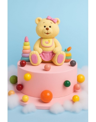 Торт на заказ в 1 ярус, покрытый шоколадным велюром нежно-розового цвета. Главным украшением торта является мишка, сидящий на шоколадном постаменте, выполненный из сладкой массы на основе какао-масла. Рядом с мишкой стоят пирамидка и юла, выполненные так же из сладкой массы на основе какао-масла. Композиция дополнена шоколадными, разноцветными шариками.