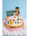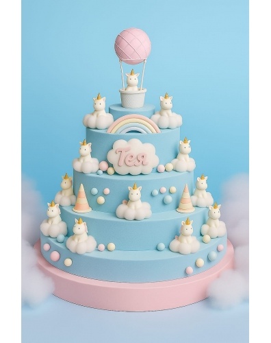 Торт в 6 ярусов, покрытый шоколадным велюром нежно-голубого цвета. Главной особенностью торта является вращающиеся верхние ярусы торта, с единорогами, радугой и воздушным шаром, выполненными из сладкой массы на основе какао-масла. Боковая сторона ярусов украшена розовым сахарным кружевом, а так же шоколадными разноцветными нежными шарами покрытыми перламутром. Главными героями выступают Единороги на карамельных облачках.