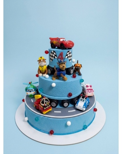 Торт круглый в 3 яруса. Покрыт голубым шоколадным велюром. Дополнительную высоту и объем торту придают подставки из шин между каждого яруса. На верхнем ярусе расположена фигурка Молнии Маквин из сладкой массы на основе какао-масла. На боковой поверхности верхнего яруса с лицевой стороны располагаются с двух сторон черно-белые сигнальные флаги. Средний ярус украшают фигурки персонажей из мультсериала Щенячий патруль в разных живых позах, выполненные из сладкой массы. На нижнем яруса расположена дорога из сладкой массы, на которой расположены с двух сторон 4 фигурки из мультсериала Робокар Полли. Дополнительно торт украшен маленькими карамельными и шоколадными шарами в красном, голубом и белом цвете.