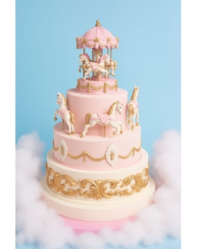 Торт в 2 яруса, покрытый нежно-розовым шоколадным велюром. На верхнем ярусе расположена шоколадная карусель с подсветкой, выполненная из бельгийского шоколада. На нижнем ярусе по кругу расположены шоколадные, бело-золотые лошадки. Нижний ярус по боковой части украшен белыми маленькими рамочками с золотыми камелиями в них, а так же гирляндой из золотых бусинок.