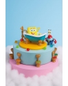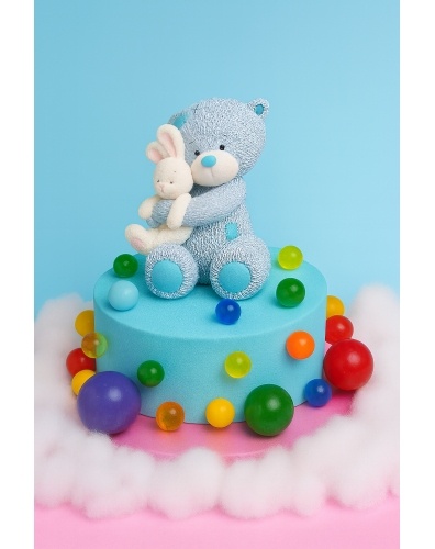 Торт в 1 ярус, покрытый голубым шоколадным велюром. Главным украшением торта является фигурка Мишки, обнимающая зайку, выполненные из сладкой массы на основе какао-масла. Дополняет композицию шоколадные и карамельные, разноцветные шары.