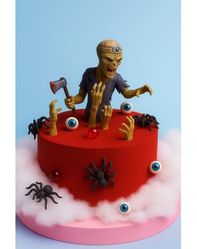 украшением торта является фигурка зомби, "торчащие" из торта руки, пауки