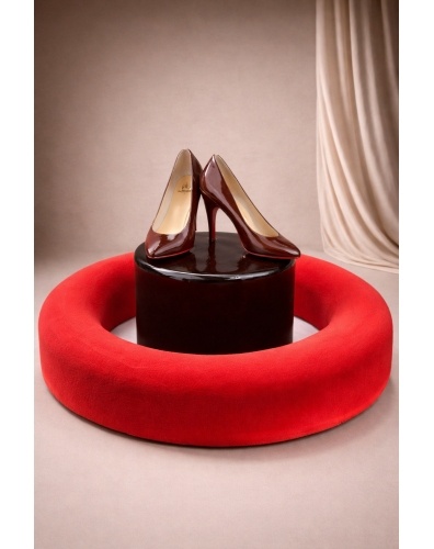 Необычный и красивый торт с шоколадными туфельками на подставке. Начинка располагается в кольце вокруг туфелек под красным шоколадным велюром.