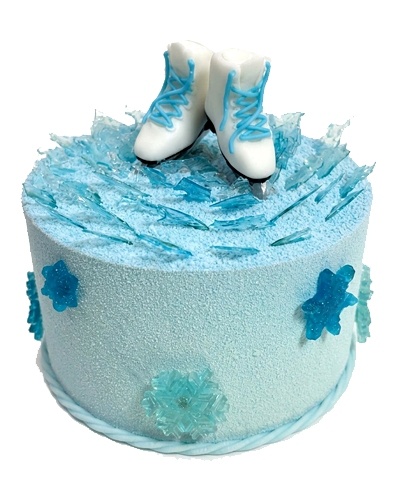 Торт круглой формы в 1 ярус, покрытый шоколадным велюром нежно-голубого цвета. Главным акцентом на торте является композиция: женские фигурные коньки в белом цвете, выполненные скульптором-художником вручную из сладкой массы на основе какао масла и шоколада. Расположены по центру торта в позиции "на носочках лезвий". По кругу фигурки расположена воздушная карамель в сине-голубом цвете, имитирующая воду. Дополнительным украшением на боковой поверхности торта являются карамельные снежинки разного размера в синем и голубом цвете.