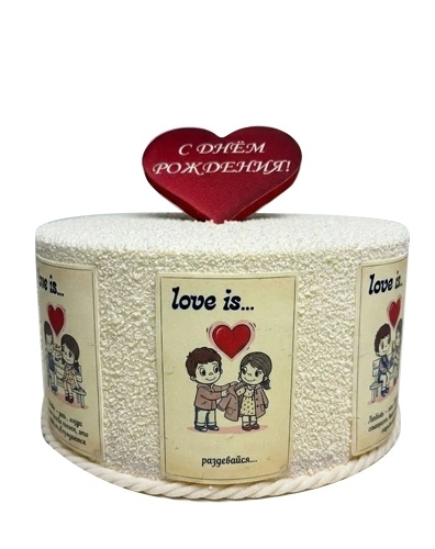 Круглый торт в 1 ярус, покрытый белым шоколадным велюром. Главным украшением торта выступают вкладыши в стиле Лав из … по бокам торта и шоколадное сердечко с фотопечатью сверху торта. По низу торт украшен канатиком из сладкой массы и шоколадным логотипом в цвет торта. Варианты дизайна вкладышей и текста подбираются индивидуально.