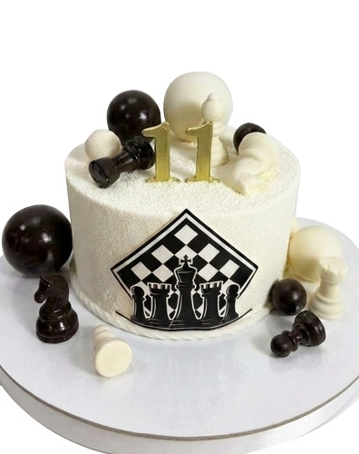 круглый в 1 ярус, покрыт белым шоколадным велюром. На поверхности