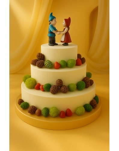 Торт в 3 яруса, покрытый шоколадным велюром цвета слоновой кости. Верхний ярус торта украшают фигурки гномов держащихся за руки, выполненные из сладкой массы на основе какао-масла. Нижний ярус торта украшен шоколадными шишками, карамельными зелеными шарами и клубничками, выполненными из сладкой массы на основе какао-масла.