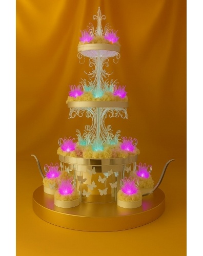Каждый ярус торта украшен большими карамельными цветами с подсветкой и