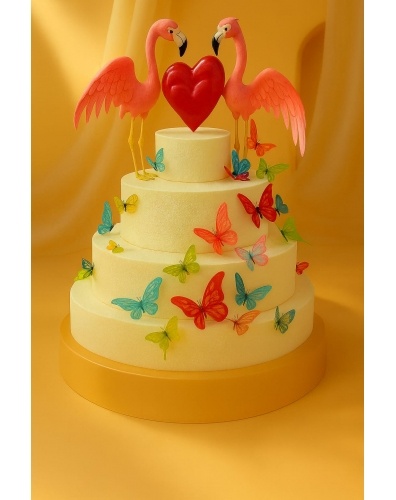Главным украшением торта являются пара розовых фламинго, стоящие на