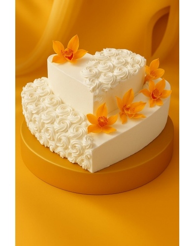 Нежный свадебный торт на заказ в форме сердца, 2 яруса, отделка - орхидеи, покрытие - шоколадный бархат белого цвета.