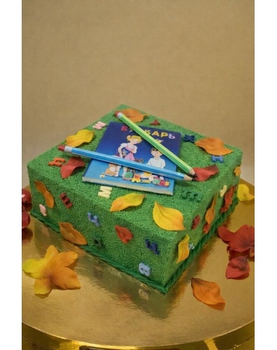 Торт на заказ в 1 ярус, покрытый шоколадным велюром зеленого цвета. Главным украшением торта является шоколадный букварь и два карандаша, выполненные из сладкой массы на основе какао-масла. Композиция дополнена разноцветными листиками, выполненными из сладкой массы на основе какао-масла, и шоколадными буквами.