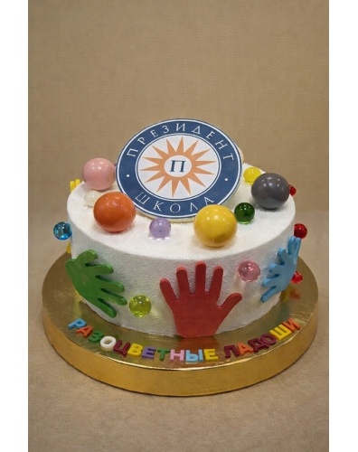 кости. Торт украшен разноцветными ладошками, выполненными из сладкой
