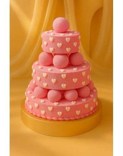 Розовый торт в 3 яруса, покрытый шоколадным велюром ярко-розового цвета. Каждый ярус торта украшен шоколадными полусферами в тон торта и маленькими, белыми, шоколадными сердцами. Дополнительную высоту и объем торту придают подставки из шаров.