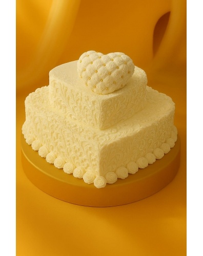 Торт к 14 февраля на заказ покрыт белым бархатом (шоколадным велюром), 2 яруса украшены узором из воздушного ванильного крема. Наверху - белое сердце из шоколада.