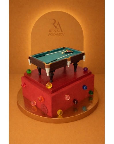 Главным украшением торта является бильярдный стол, выполненный и сладкой массы на основе какао-масла, на шоколадном подиуме.