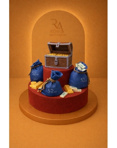 Торт на заказ в 2 яруса, покрытый шоколадным велюром красного цвета. Верхний ярус торта украшает стоящий на шоколадной подставке сундук с золотыми монетами, выполненный из сладкой массы на основе какао-масла. Нижний ярус торта украшен денежными мешками, которые так же выполнены из сладкой массы на основе какао-масла. Композиция дополнена