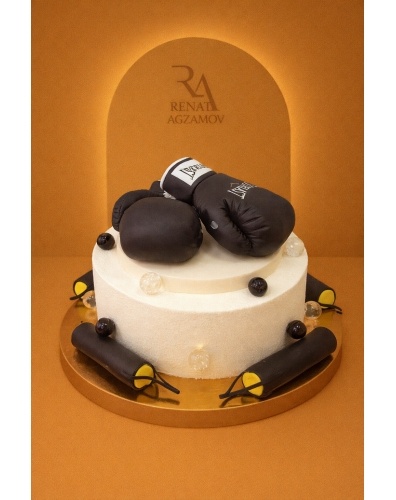 Торт на заказ в 1 ярус, покрытый шоколадным велюром цвета слоновой кости. Главным украшением торта являются боксерские перчатки, лежащие на шоколадном диске и выполненные из сладкой массы на основе какао-масла по фото. Боковая