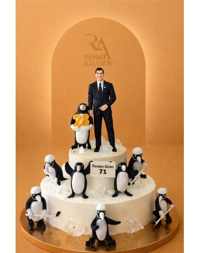 украшения является фигурка известного хоккеиста, выполненная по фото из сладкой массы на основе какао-масла, и 8 пингвинов-хоккеистов, выполненных так же из сладкой массы на основе какао-масла. Завершают композицию на хоккейном торте льдинки из карамели.