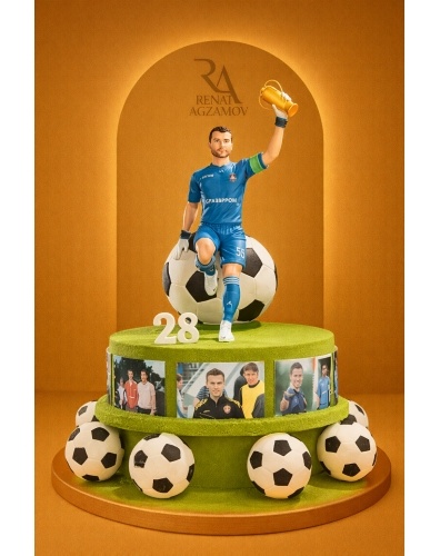 Яркий торт на заказ для любителей футбола, торт для футболиста весом от 6 кг покрыт зеленым шоколадным велюром. Главное