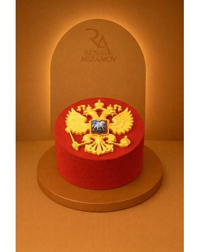 Необычный, яркий торт в 1 ярус, покрытый шоколадным велюром красного цвета. Главным украшением торта является государственный герб РФ, сделанный из бельгийского шоколада и покрытый пищевым золотом.