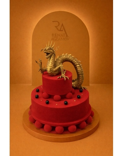 Торт на заказ в 2 яруса, покрытый шоколадным бархатным велюром красного цвета. Главным украшением торта является Китайский Дракон, выполненный из сладкой массы на основе какао-масла. Нижний ярус украшают карамельные черные шарики. Между ярусами использованы подставки из шоколадных шаров.