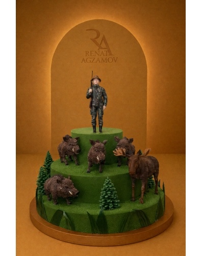 Яркий торт на заказ для мужчин в 3 яруса, покрытый шоколадным велюром зеленого цвета. Верхний ярус торта украшает фигурка охотника, выполненная из сладкой массы на основе какао-масла по фото. Средний и нижний ярус украшают фигурки кабанов и лося, выполненных из сладкой массы на основе какао-масла. Дополняют композицию украшающие нижний ярус елочки. Боковую сторону нижнего яруса украшают шоколадные листья, выполненные из бельгийского шоколада.