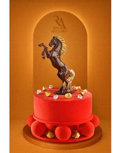 Лаконичный торт на заказ для мужчины с лошадью на подставке из шоколадных шаров выполнен в один ярус выполнен в стиле минимализма. Торт покрыт красным шоколадным велюром, вес от 5 кг.