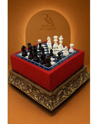 торта являются шоколадные шахматы, стоящие на имитации шахматной доски,