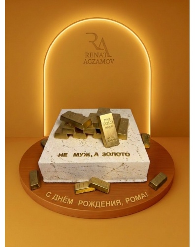 Торт в 1 ярус, прямоугольной формы, покрытый белым шоколадным велюром. Вся поверхность и боковая сторона торта покрыта золотыми брызгами. На поверхности торта расположены шоколадные слитки золота равномерной горкой (размер слитков 7см шириной на 15 см высотой). Перед слитками на поверхности торта с лицевой стороны в центре расположена надпись маленькими золотыми: НЕ МУЖ, А ЗОЛОТО. Дополнительно торт украшен по низу маленькими слитками золота из шоколада. Торт поставляется на ДСП.